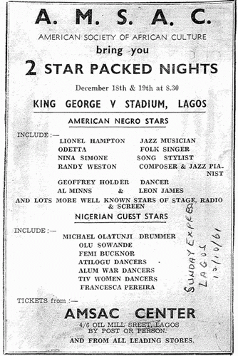 Here is a local newspaper announcement for the musical programme of the festival. (Courtesy: Sunday Express [Lagos], 12 October 1961. Courtesy of Moorland–Spingarn Research Center (MSRC), Howard University, American Society of African Culture (AMSAC) Manuscript Collection)