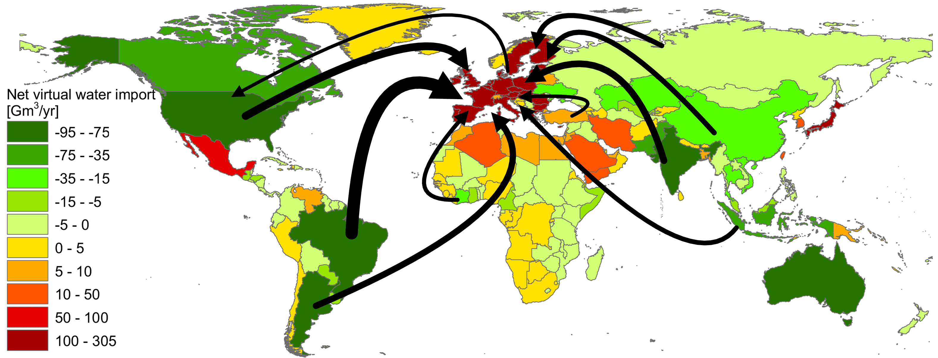 Many Northern European countries import water in virtual form by importing agricultural and other food products. They have a net import, which helps them save water in their own countries – not necessarily scarce – while using the reservoirs in other, often less prosperous countries. This map shows the exports and imports in virtual water around the world – with respect to Europe specifically.