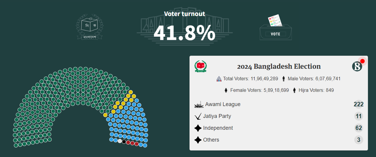 Bangladesh's Prime Minister Sheikh Hasina has won a fifth term in power with her party taking three-quarters of seats in parliament, election officials said Monday after polls boycotted by the opposition as a "sham". "The Awami League has won the election," said Moniruzzaman Talukder, a joint secretary of the Election Commission a day after a vote boycotted by the opposition, with initial reports suggesting a meagre turnout of some 40 percent. Talukder said Hasina's party had won 223 seats, but support of other lawmakers including from allied parties, means Hasina's actual control over the 300 seat parliament is even higher, analysts said. (Source: "Bangladesh Elections 2024 Highlights: PM Sheikh Hasina re-elected for 5th term in office" / Live Mint)