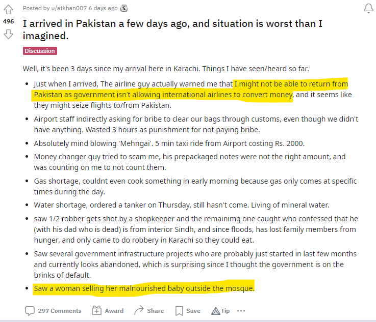 There are many indicators to share the hopeless situation that Pakistan is in, but this sharing on Reddit by an overseas Pakistan visiting his country puts things in context in the best way.