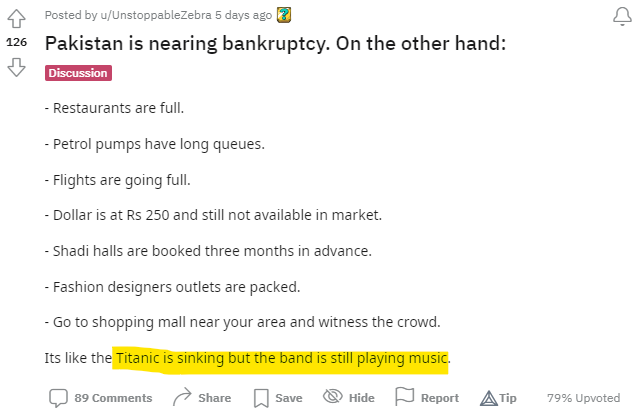 There seems to be a complete disconnect between the real financial and economic situation of Pakistan and the way its inhabitants, leaders, and supporters are behaving.