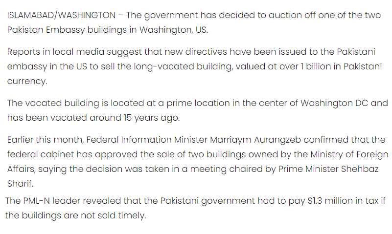 Pakistan has a building owned by the consulate but not used for the last few years. This building is now on sale. Apparently, the consulate will have to pay $1.3 million in fines and taxes which they cannot afford.