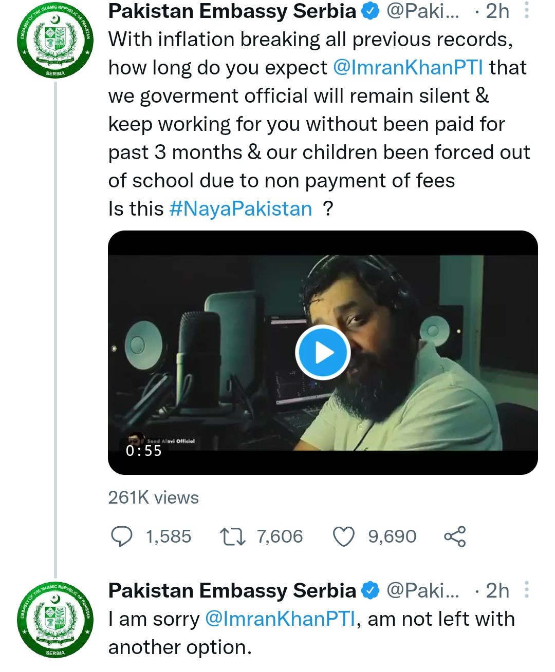 In December 2021, an employee of the Pakistani Consulate in Serbia had tweeted (which was brought down later) about how they had not been paid for 3 months and their kids had been forced out of the schools.
