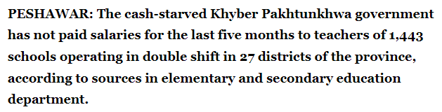 The government of Khyber Pakhtunkhwa has not paid the salaries to their employees since October now. (Source: Pakistan: KP govt's financial health deteriorates, fails to pay salaries to employees /ANI News) The teachers have not been paid their salaries since November.