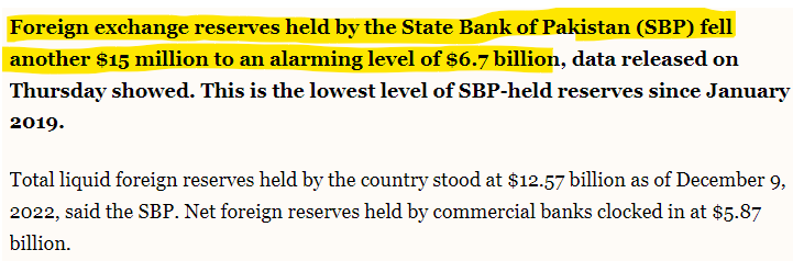 The foreign exchange reserves in Pakistan have hit a new low. The total reserves with the Central Bank are now $6.7 billion!