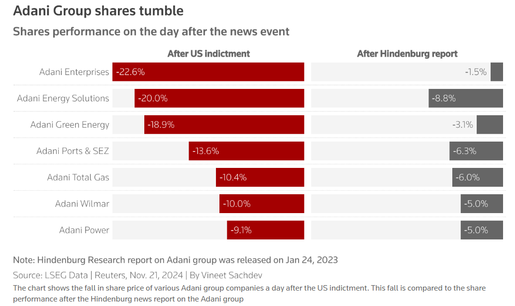 The market capitalisation of Adani Group stocks plunged by Rs 2.24 lakh crore, equivalent to $26 billion, following accusations by US authorities against Gautam Adani, his companies and executives regarding bribery and fraud on Thursday. (Source: Times of India)