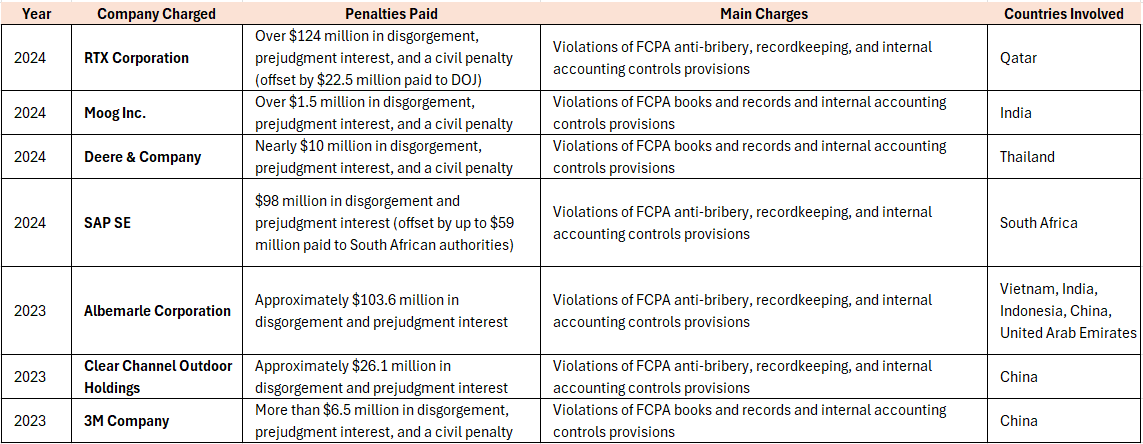 Here's a table summarizing select Foreign Corrupt Practices Act (FCPA) enforcement actions by the U.S. Securities and Exchange Commission (SEC) from 2023 to 2024.