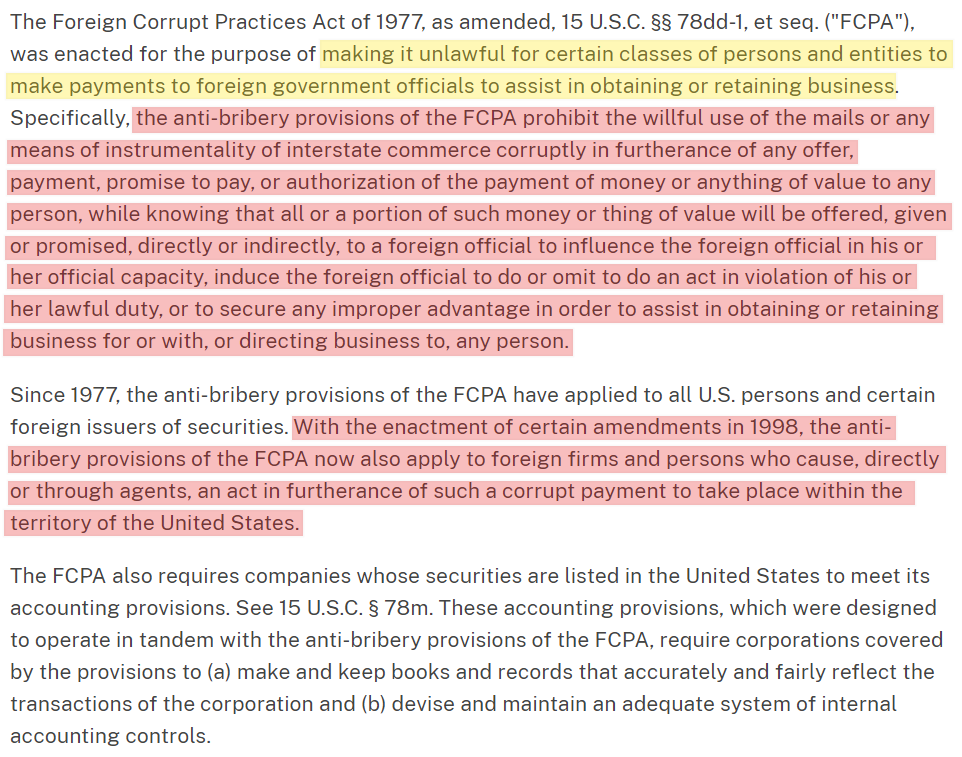 You can see the framework for indicting companies that are listed on any US exchange for debt or equity and involved in bribery or "corrupt practices" is very tight.