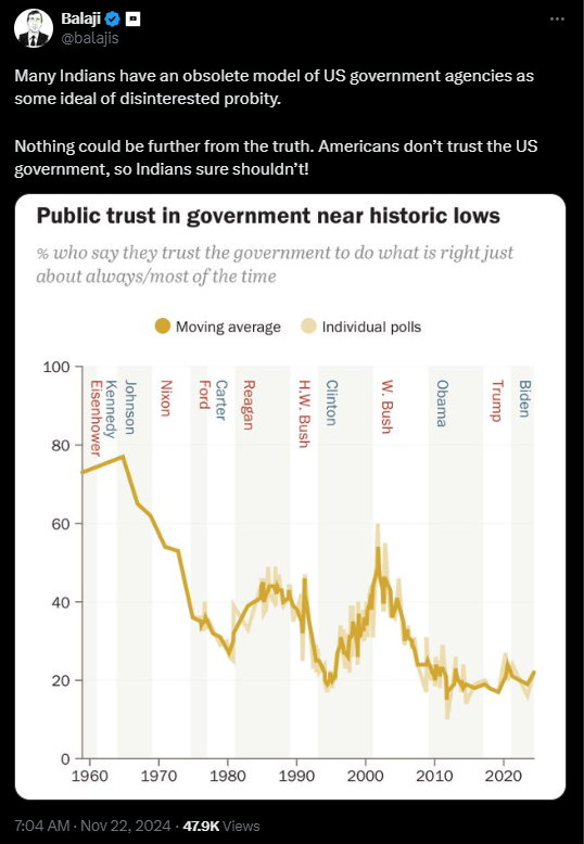 US government - under Biden - does not have the trust of the people and has lost its integrity. The election mandate for Trump is to take the corrupt structures that have been erected apart.