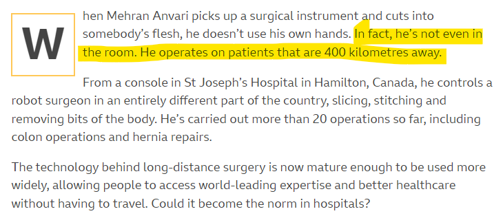 Doctors carry out surgeries sitting 400 km away using robotic arms and instruments on patients. In fact, robots have already been proven to make incisions and sutures better than the trained hands of a Human Surgeon!