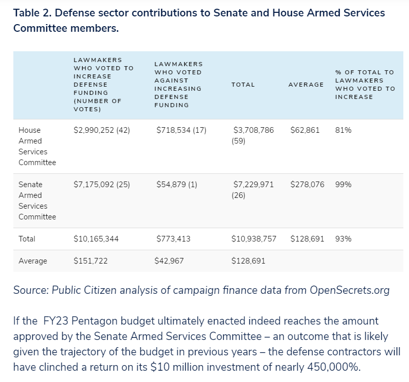 The vast majority of these campaign contributions went to members who voted to increase the Pentagon budget above the president’s $813 billion recommendation. Specifically, House Armed Services Committee members who voted “yes” to increasing the FY23 Pentagon budget by $37.5 billion on June 22, 2022, received a total of $3 million from the defense industry in the 2022 election cycle. Senate Armed Services Committee members who voted “yes” to increasing the FY23 Pentagon budget by $45 billion on June 16, 2022, received a total of $7.2 million from the defense industry in the 2022 election cycle. (Source: Military-Industrial Complex Clinches Nearly 450,000% Return on Investment / Public Citizen)
