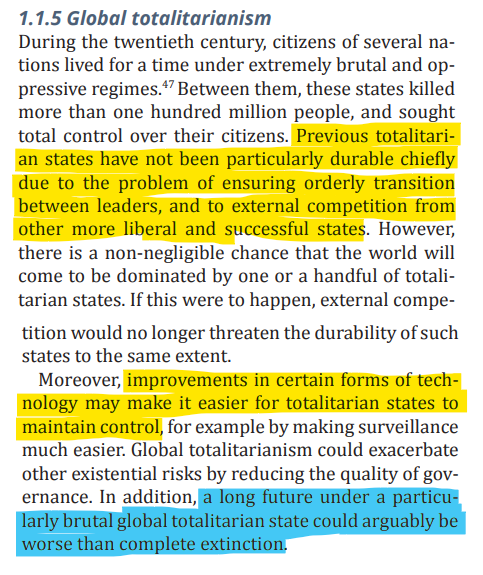 So imagine a world where a global totalitarian government uses cutting-edge powerful technologies to lock the rest of the population around the world into perpetual suffering.
