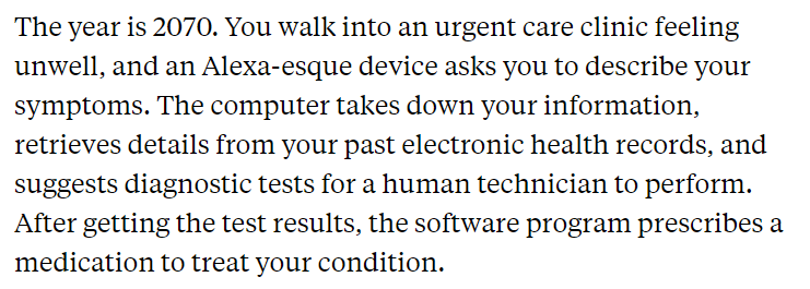 In a recent paper, David Dranove and Craig Garthwaite, professors of strategy at Kellogg, explored the implications of incorporating AI into healthcare—in particular, how such software would affect the central role of the physician. For now, the need for human interaction in healthcare is likely to keep AI on the sidelines as a complement, rather than a substitute, for doctors, Dranove says. But perhaps in a few decades, patients will be comfortable interacting with computers and even trust them as their main source of medical guidance. “Maybe in the long run, that will change,” he says. (Source: Source: Will AI Eventually Replace Doctors? / Kellogg Insight)