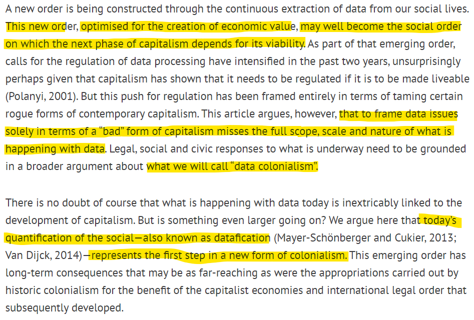 When we talk about Surveillance Capitalism one wonders if we should be talking about Colonialism as well. Nick Couldry and Ulises A. Mejias write in the “Internet Policy Review” journal that yes, the creation of economic value is the argument for data enterprises. But the real consequence is colonialism.