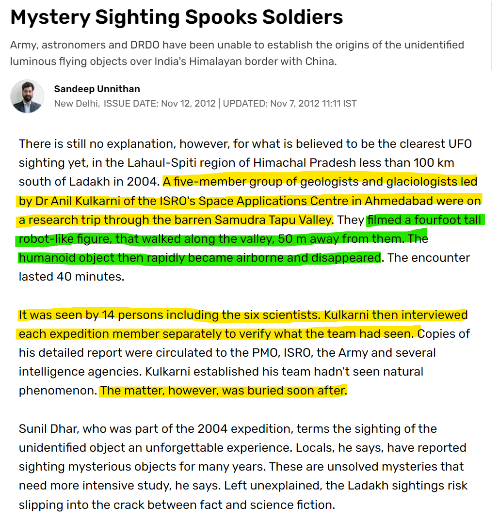 The ITBP unit that mans India's border with Chinese-occupied Aksai Chin first spotted the UFO on 1 August. By 15 October it had logged more than 100 sightings of the "Unidentified Luminous Objects" appearing from the Chinese side, then hovering for between three and five hours before departing. These logs went all the way to the top, even reaching the prime minister's office. As a result, the 14 Corps deployed a team in September to install a mobile ground-based radar unit and a spectrum analyser to a mountain near Pangong Lake, bordering India and China – the presence of the two should have ensured that no radio frequencies or foreign objects in the region were missed. However, when the objects passed, neither piece of kit picked anything up. A drone was also sent to chase the object, but soon lost it when it reached its maximum flight height. (Source: "Have humanoid UFOs returned to India? The army thinks so" / The Wired)