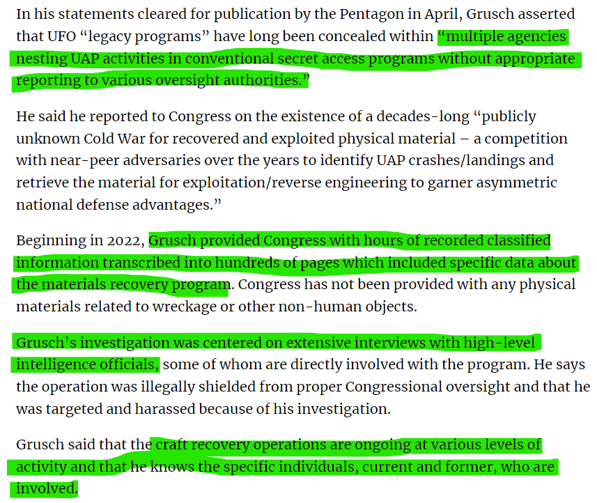 In the Debrief story, Grusch shared that he had provided the Congress with hours of recorded classified information that had been transcribed in hundreds of pages. He also asserted that several "current members of the recovery program spoke to the Inspector General's office and corroborated the information Grusch had provided for the classified complaint."