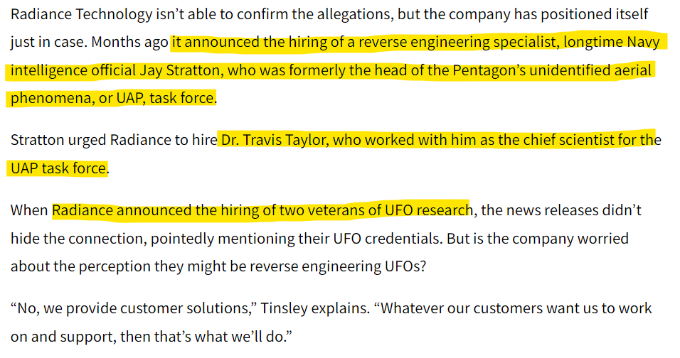 The link between what Radiance is doing in terms of cutting-edge weapons technology and UFO studies in Pentagon became clear when Radiance technologies hired two "UFO veterans" from Pentagon.