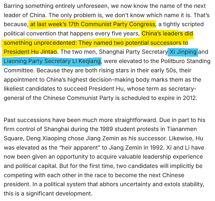 In October 2007, at the 17th Communist Party Congress, something unprecedented had happened. Hu Jintao, who was brought in after Jiang Zemin allowed two potential successors to be elevated.