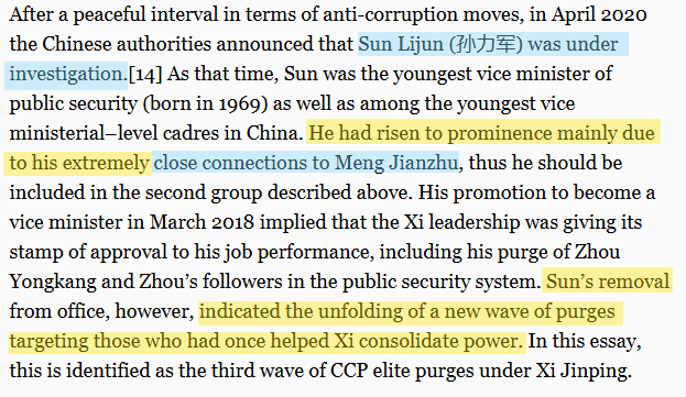 - Purges of Meng's associates: A series of purges have targeted officials who were promoted under Meng's leadership of the zhengfa system. This includes high-ranking officials in the public security apparatus who were considered close to Meng.