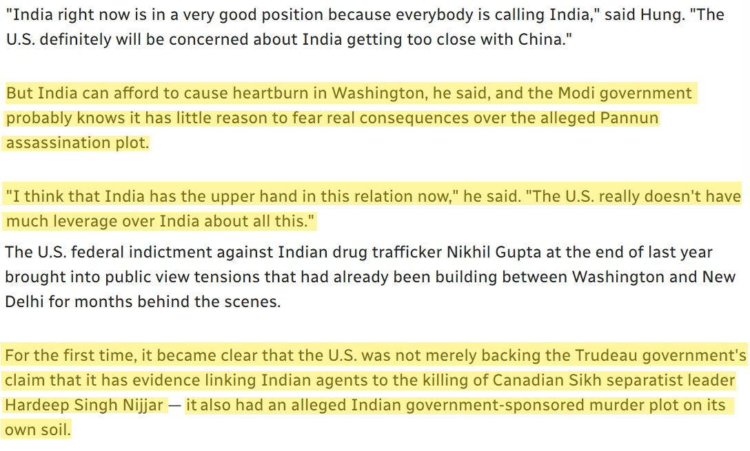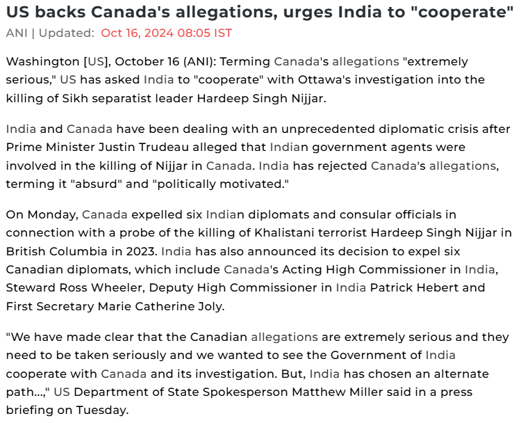 CBC captures the moves by the US and Canada to "corner" India via the rather ridiculous and unsubstantiated allegations of Indian government officials involved in the killings of Sikh terrorists who openly call for targeted violence against Indian leaders in India and consulate members in the US and Canada (a Geneva convention violation).