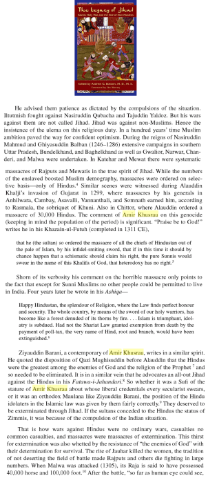 that he (the sultan) so ordered the massacre of all the chiefs of Hindustan out of the pale of Islam, by his infidel-smiting sword, that if in his time it should by chance happen that a schismatic should claim his right, the pure Sunnis would swear in the name of this Khalifa of God, that heterodoxy has no right.Khaza’inul Futuh, Extract from “The Legacy of Jihad” by Andrew Bostom