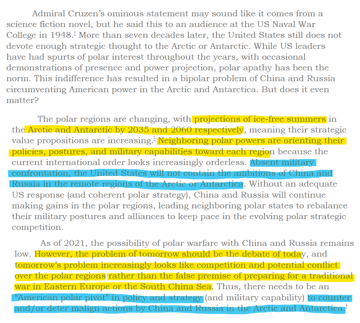 "As of 2021, the possibility of polar warfare with China and Russia remains low. However, the problem of tomorrow should be the debate of today, and tomorrow’s problem increasingly looks like competition and potential conflict over the polar regions rather than the false premise of preparing for a traditional war in Eastern Europe or the South China Sea. Thus, there needs to be an “American polar pivot” in policy and strategy (and military capability) to counter and/or deter malign actions by China and Russia in the Arctic and Antarctica."