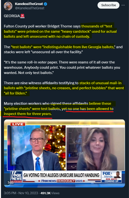 stacks of unusual mail-in ballots with "pristine sheets, no creases, and perfect bubbles" that went "all for Biden."