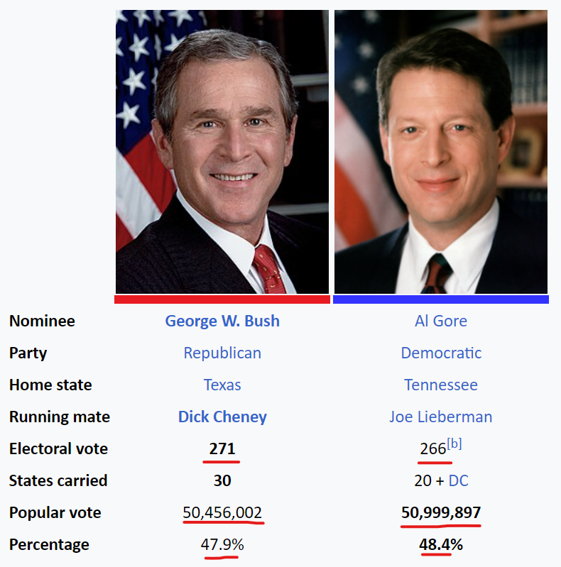 Al Gore had won the popular vote by 543,895 votes. But he lost the election. Because the "Electoral College" voted otherwise.
