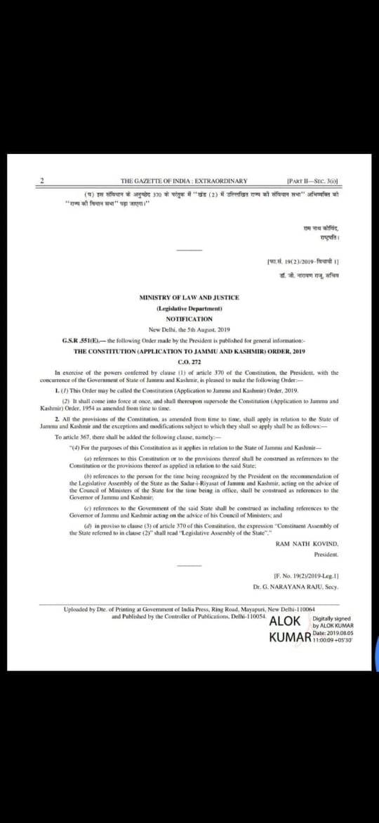 “The President on the recommendation of the Parliament is pleased to declare that as from August 5, 2019, all clauses of the said Article 370 shall cease to be operative..” said the resolution.