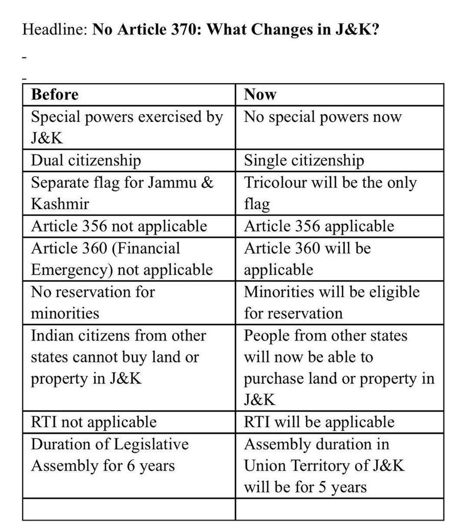 Special powers and Separate constitution: J&K had a separate constitution per the provisions of Article 370. Now those special powers and the separate constitution is gone. Now, Jammu and Kashmir will align with the Constitution of India.