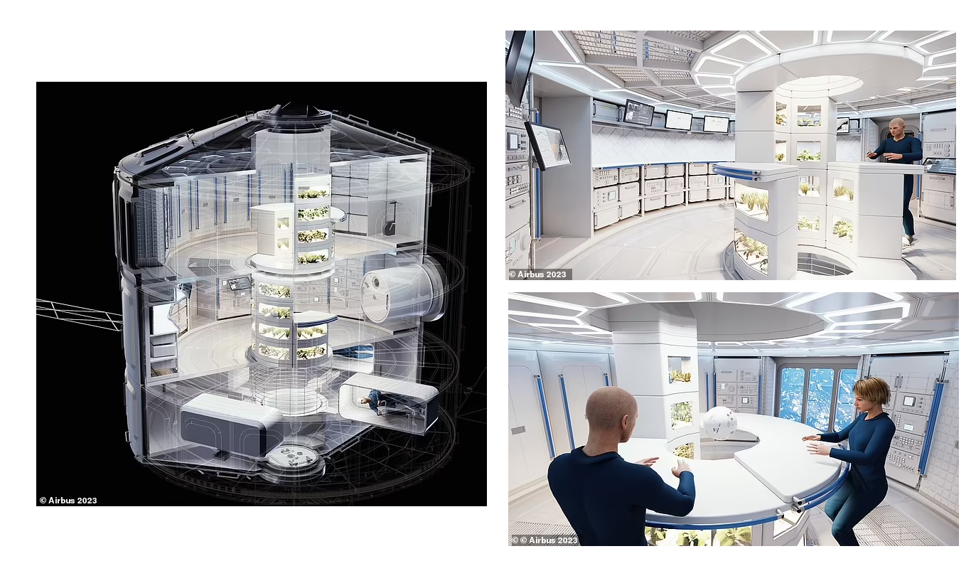 Airbus has unveiled plans for a three-deck space station, named LOOP, that is more spacious than existing stations. It could be launched within the next decade and is designed for a crew of four. The module features a habitation deck and a science deck, connected by a central tunnel. The final floor is a centrifuge that creates Earth-like gravitational conditions, reducing the impact of weightlessness on the human body. The centre of the station's structure is a three-storey column acting as a greenhouse for growing crops.