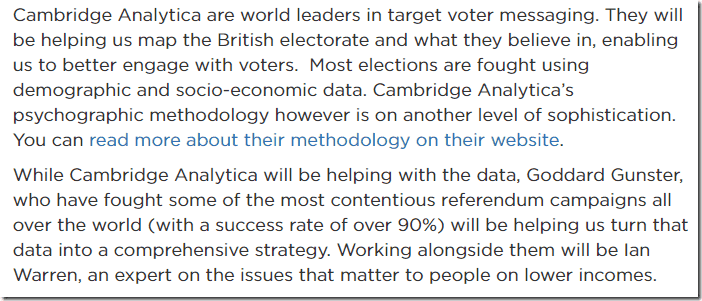 A new subsidiary was created for US elections – Cambridge Analytica. Nigel Farage, the radical politician of Britain and at the forefront of the BREXIT campaign had signed up Cambridge Analytica (webpage since brought down – snapshot from archive.org) in November 2015.