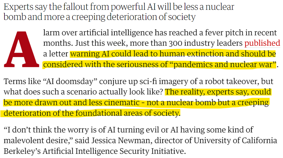 Experts have been divided on the timeline of AGI’s development, with some arguing it could take decades and others saying it may never be possible, but the rapid pace of A.I. advancement is starting to turn heads. Around 57% of A.I. and computer science researchers said A.I. research is quickly moving towards AGI in a Stanford University survey published in April, while 36% said entrusting advanced versions of A.I. with important decisions could lead to “nuclear-level catastrophe” for humanity. Other experts have warned that even if more powerful versions of A.I. are developed to be neutral, they could quickly become dangerous if employed by ill-intentioned humans. “It is hard to see how you can prevent the bad actors from using it for bad things,” Geoffrey Hinton, a former Google researcher who is often called the godfather of A.I., told the New York Times this week. “I don’t think they should scale this up more until they have understood whether they can control it.” (Source: OpenAI’s former top safety researcher says there’s a ‘10 to 20% chance’ that the tech will take over with many or most ‘humans dead’ / Fortune)
