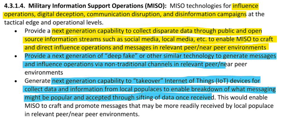 The document is very specific, the Military Information Support Operations (MISO) - basically a division for global propaganda and deception efforts - says that it wants to create the next generation of deep fakes for influence operations via non-traditional channels. Further, they want to enhance it via the data they gather by orchestrating a "takeover" of Internet of Things (IoT) devices.