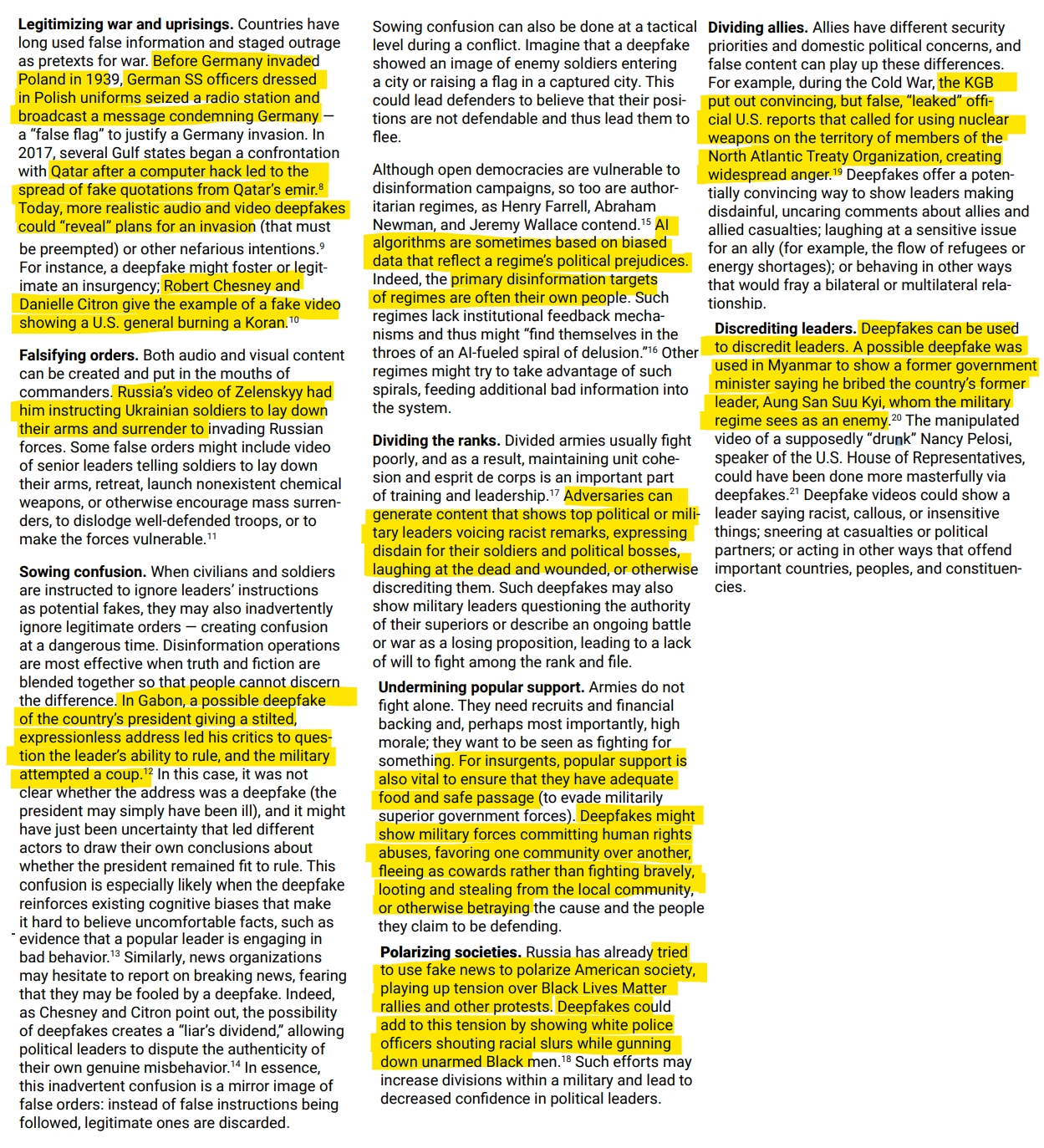 The implications of the use of deepfakes are immense. Here is a sampling of the impact in different areas that can be devastating for a country.