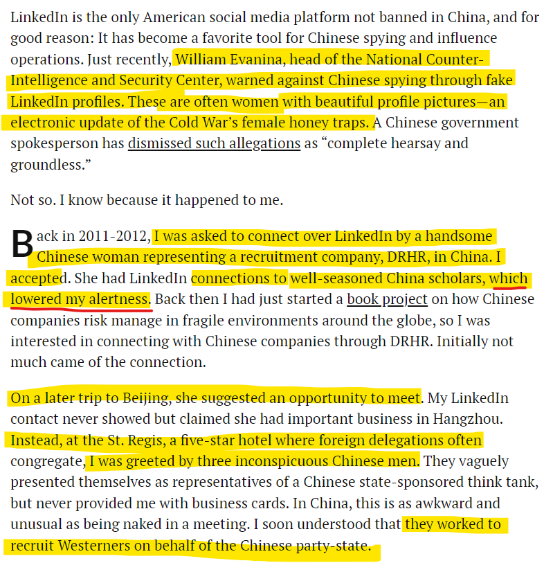 LinkedIn is a very important tool in espionage. And, the Chinese are using it to the hilt! Jonas Parello-Plesner a non-resident senior fellow at the Hudson Institute got a taste of how it could be used.