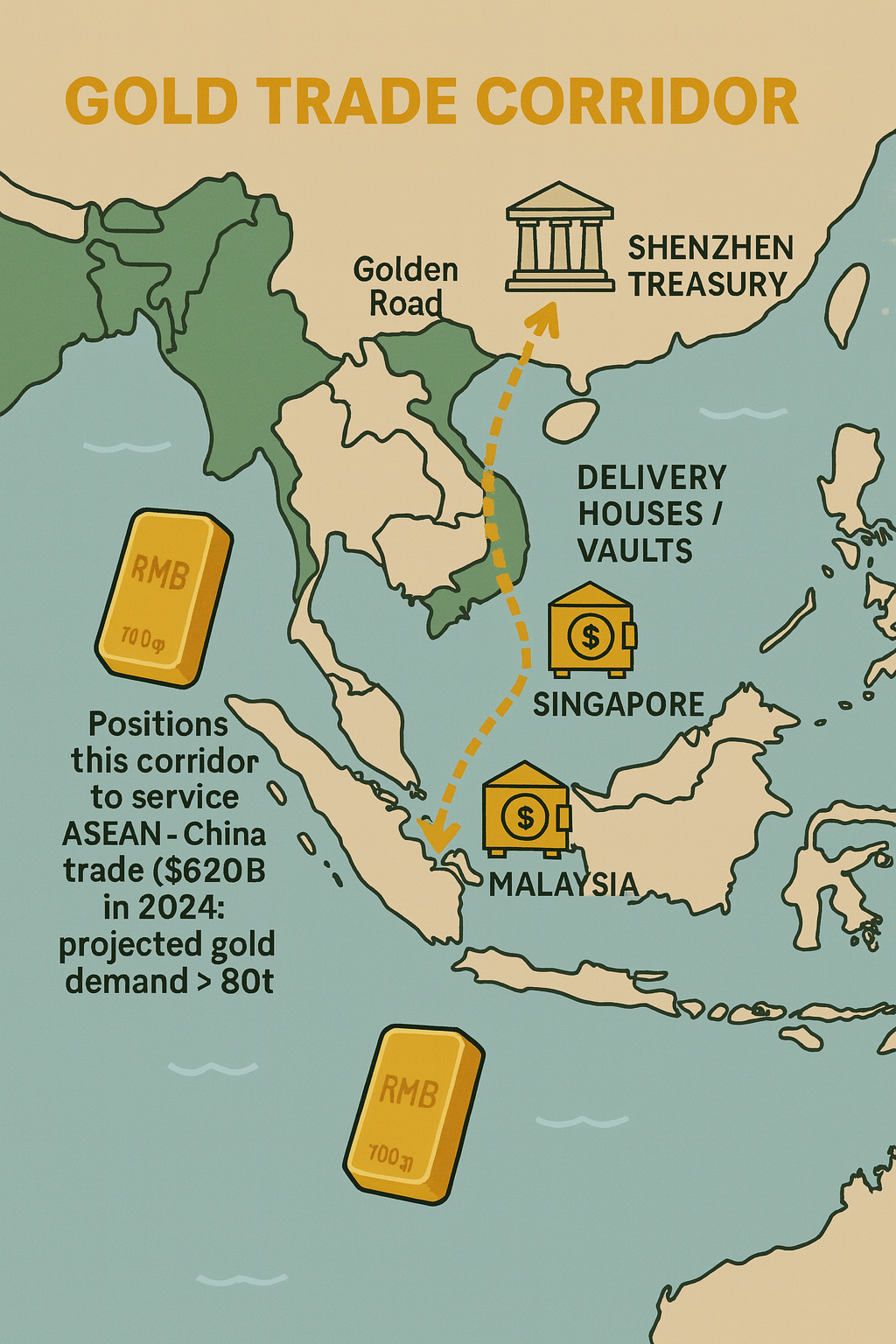 China’s second significant step toward a global gold-settlement network focuses on Southeast Asia, where it is building a corridor of delivery houses and vaults in Singapore and Malaysia to handle cross-border bullion flows.