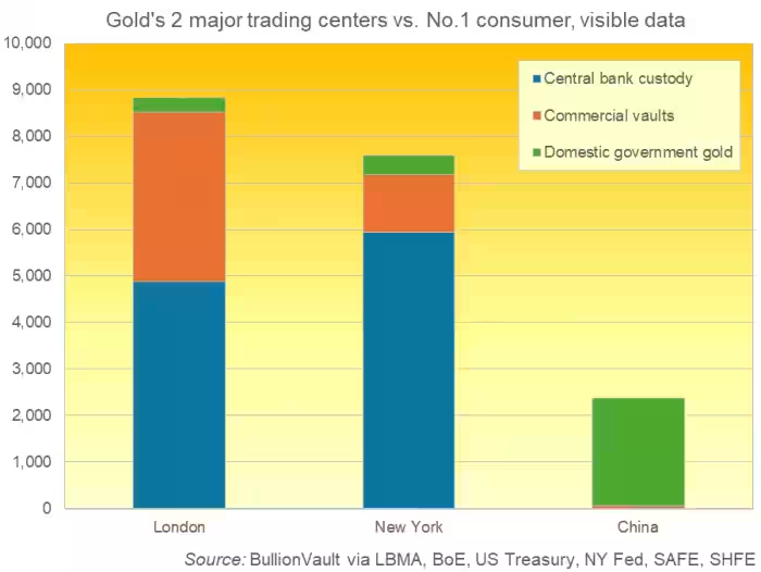 The World Gold Council considers London’s bullion market, the U.S. futures market and the Shanghai Gold Exchange to be the three most important gold-trading centers in the world. (Source: Marketwatch)