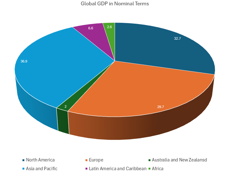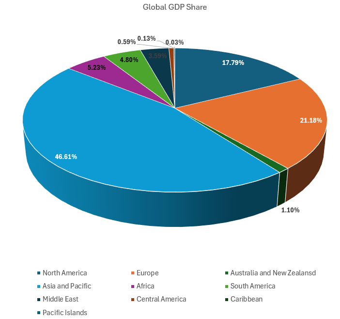 Based on projections for 2025 from the International Monetary Fund (IMF), here is a regional GDP comparison in terms of the percentage share of global GDP, using purchasing power parity (PPP).