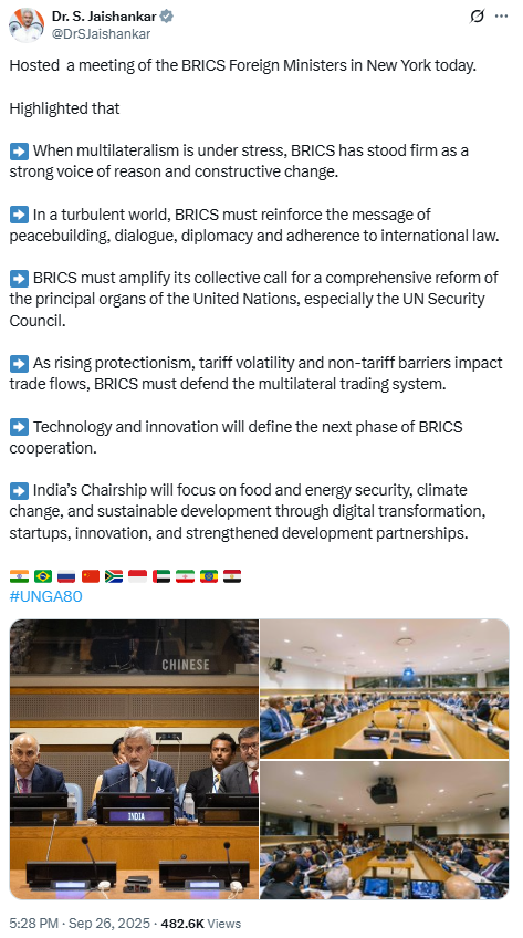 The External Affairs Minister, Dr. S. Jaishankar, publicly announced that he “hosted a meeting of the BRICS Foreign Ministers in New York” with the messaging that “when multilateralism is under stress, BRICS has stood firm.”