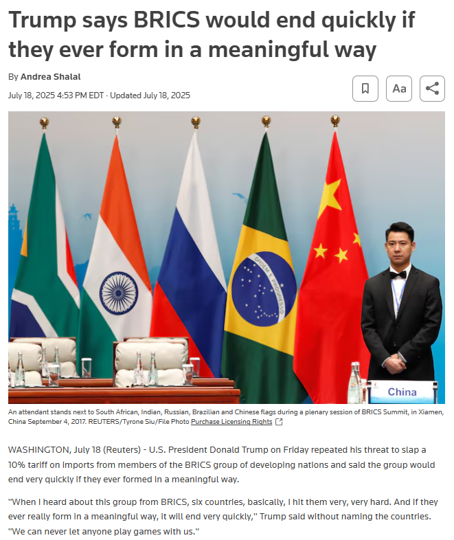 He has threatened additional tariffs (10%) on countries aligning with “anti-American policies” under the BRICS.