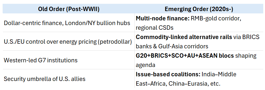 The world’s tectonic plates of power are shifting—that much is evident. But where these plates will finally settle is the larger question. The past eighty years have been shaped by a U.S.-led, dollar-centric “Old Order” that tied finance, trade, and security into Western hubs. That system is now being challenged by an emerging order that is more multipolar, commodity-anchored, and issue-driven.