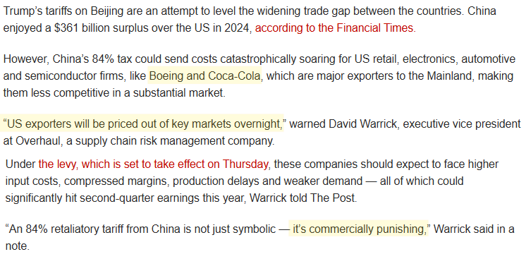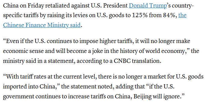 China said Tuesday it would “fight to the end” and take countermeasures against the United States to safeguard its own interests after President Donald Trump threatened an additional 50% tariff on Chinese imports. The Commerce Ministry said the U.S.‘s imposition of “so-called ‘reciprocal tariffs’” on China is “completely groundless and is a typical unilateral bullying practice.” (Source: "China says it will 'fight to the end' after Trump threatens to impose still more tariffs" / AP)