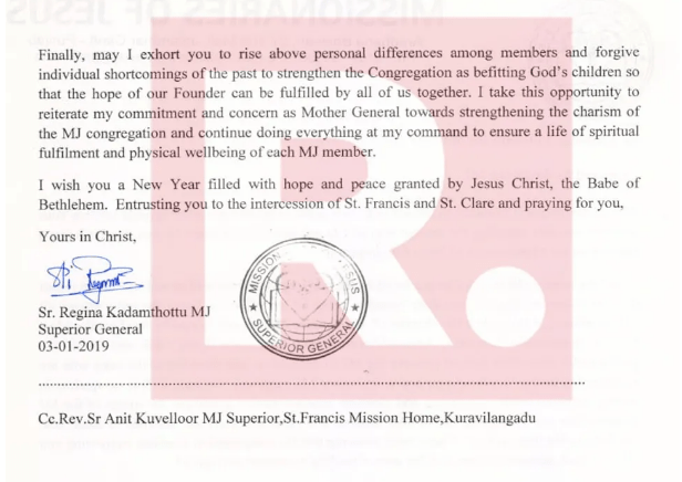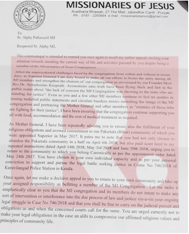 IN a letter which accuses them of nuns of ‘issuing malafide public statements’ and ‘circulating baseless stories’ and that they were working to ‘tarnish the images of MJ congregation by disobeying congregation instructions.” So much for raising voice against a crime of rape.