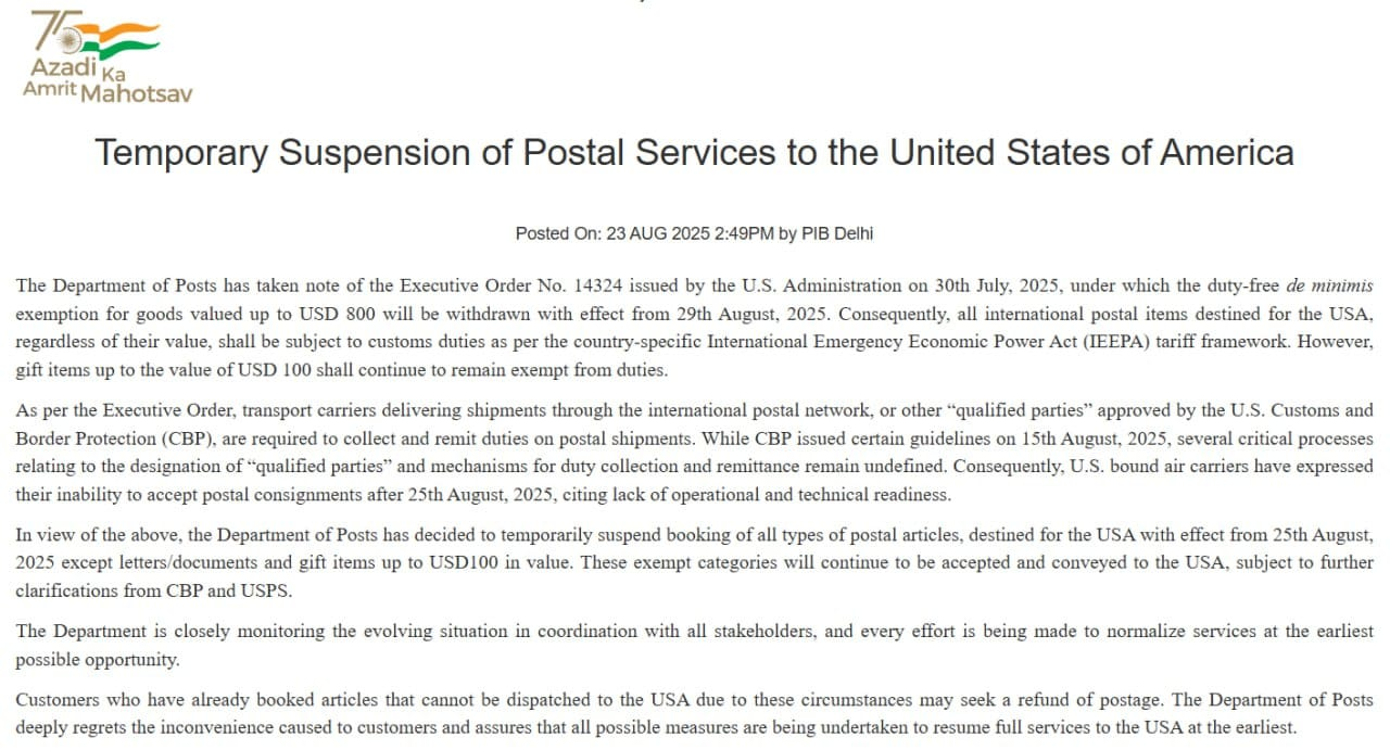 In response, India Post decided to temporarily suspend the booking and dispatch of all types of postal articles destined for the USA from August 25, 2025, except for letters/documents and exempted gifts (up to USD 100). These will continue, pending further clarifications from CBP and USPS. The situation is being monitored, and India Post expresses regret for the inconvenience, holding out hope for normalization soon.