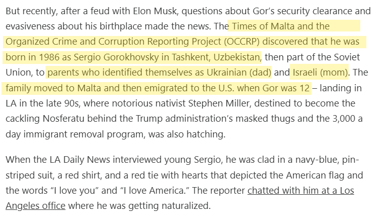 When he was a boy, Gor’s family emigrated to the U.S., where he became a citizen. His path to politics led him eventually to a job with Republican Senator Rand Paul, and then into Trump’s orbit. One of his activities with Paul was a trip to Moscow in 2018 funded by the Cato Institute, a libertarian think tank in D.C. The visit was characterized as a “fact-finding trip to research, discuss and explore issues related to Russia and the U.S.” Gor had also traveled to Moscow the year before, according to leaked Russian border records. He flew from Washington D.C. to Moscow with the Russian state carrier Aeroflot, and left the next day for Rome. The border records provide no indication of what Gor did in Moscow, and there is no evidence that his visit was connected to any improper activity. Garson explained that Gor is “an avid traveler.” (Source: "Top Trump Adviser Sergio Gor Was Born in the Soviet Union" / OCCRP)