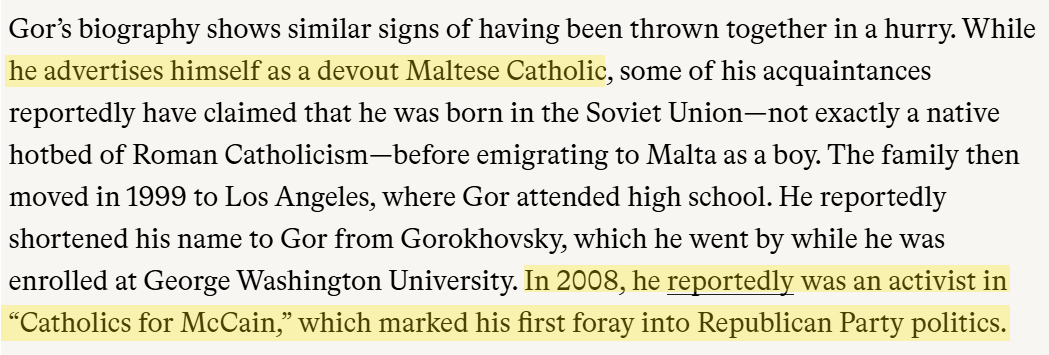 But Gor identifies himself as a Maltese Catholic. Was that a political move by him?