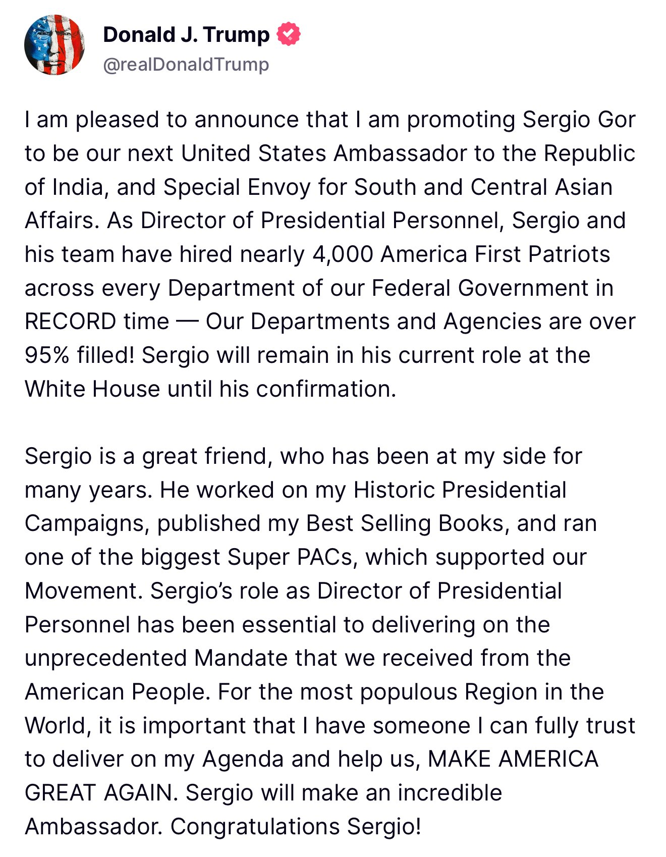 As Director of Presidential Personnel, he oversaw the hiring of nearly 4,000 officials across U.S. federal departments. Trump highlighted Gor’s loyalty and effectiveness in delivering his “America First” mandate.