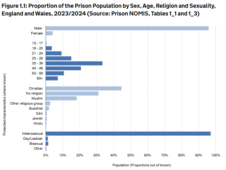 - According to the HMPPS Offender Equalities Report 2023/24, Muslims accounted for 18.2% of the prison population (15,909 prisoners), while Muslims are ~6.5% of the general population. This indicates overrepresentation