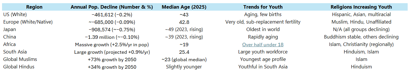 The world is undergoing a demographic split with profound consequences. On one side are contracting, top-heavy societies—US Whites, Germany, France, Japan, China—whose age pyramids are wide at the top and narrow at the base. Fertility is low, populations are shrinking, and old-age dependency is rising. These nations face labor shortages, declining tax bases, and unsustainable welfare systems. Without an infusion of youth, their economic and geopolitical influence will wither.